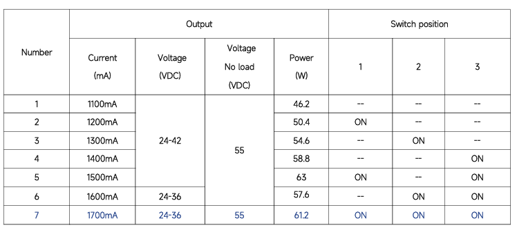 1100mA 46.2W 24-42V 1200mA 50.4W 24-42V 1300mA 54.6W 24-42V 1400mA 58.8W 24-42V 1500mA 63W 24-42V 1600mA 57.6W 24-36V 1700mA 61.2W 24-36V